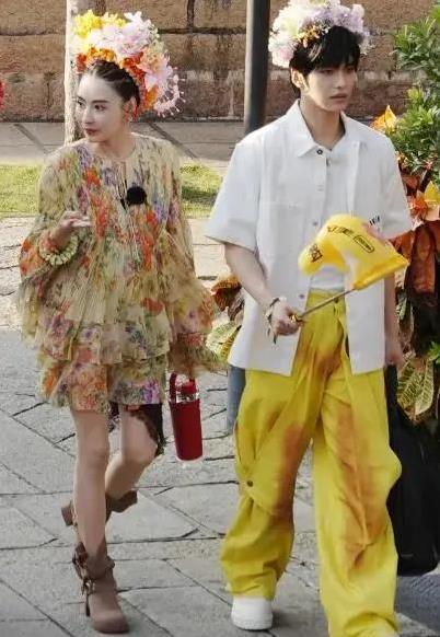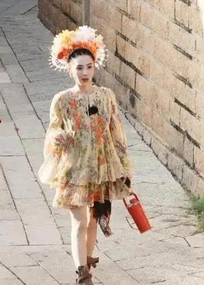 那条碎花裙子选得也聪明。不是那种大红大绿的艳俗款,而是明黄色底上印着小碎花,既有传统的味道,又不会显得老气。裙摆够长,走起路来一飘一飘的,配合着头上的簪花围,整个造型就有了那种古典美人的感觉。