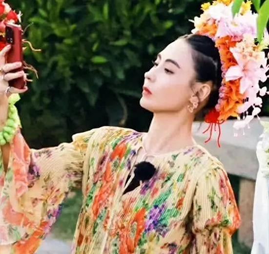 张柏芝的脸型特别适合戴这种头饰。她的五官立体,额头饱满,颧骨也高,这种骨架子戴上簪花围不会显得头重脚轻。反而因为她脸上的线条够硬朗,把那些花花草草的柔美给中和了,看着就很舒服。